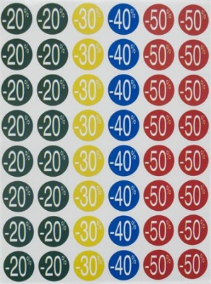Színes, előnyomott kör címkék különböző kedvezmények jelölésére. Átlátható és figyelemfelkeltő megoldás akciókhoz!